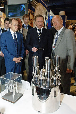 Генеральный директор государственной корпорации "Росатом" Сергей Кириенко, вице-премьер РФ Сергей Иванов и инженер "Росатома" Владимир Голушкин (слева направо) на выставке по развитию атомной энергетики в центральном выставочном центре "Экспоцентр" в Москве