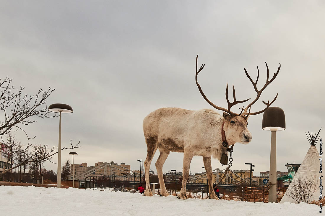 В московском парке "Музеон" сегодня необычные посетители: олени и их хозяева, коренные жители Севера, решили обратиться отсюда к президенту России