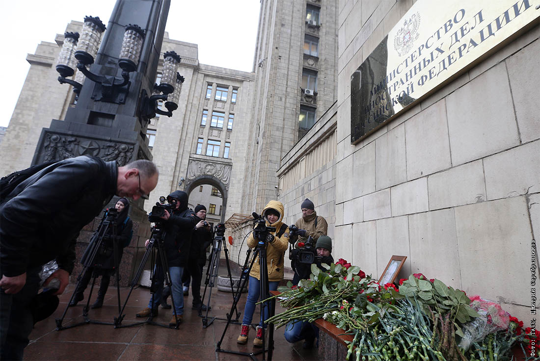 Москвичи несут цветы к зданию Министерства иностранных дел в память о постпреде России при ООН Виталии Чуркине, скончавшемся накануне от сердечного приступа