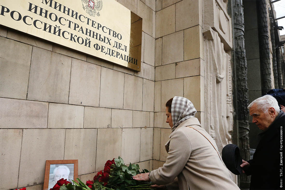Москвичи несут цветы к зданию Министерства иностранных дел в память о постпреде России при ООН Виталии Чуркине, скончавшемся накануне от сердечного приступа