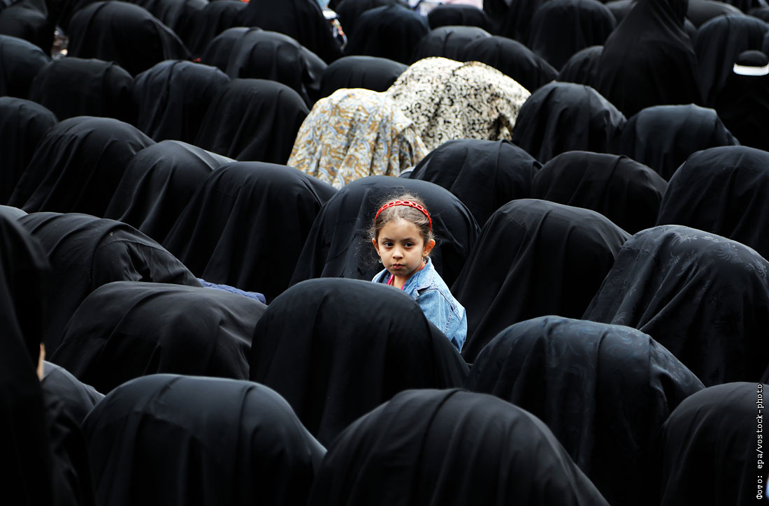 Молитва во время траурной церемонии в память о младшей дочери пророка Мухаммеда в Тегеране. Иран.