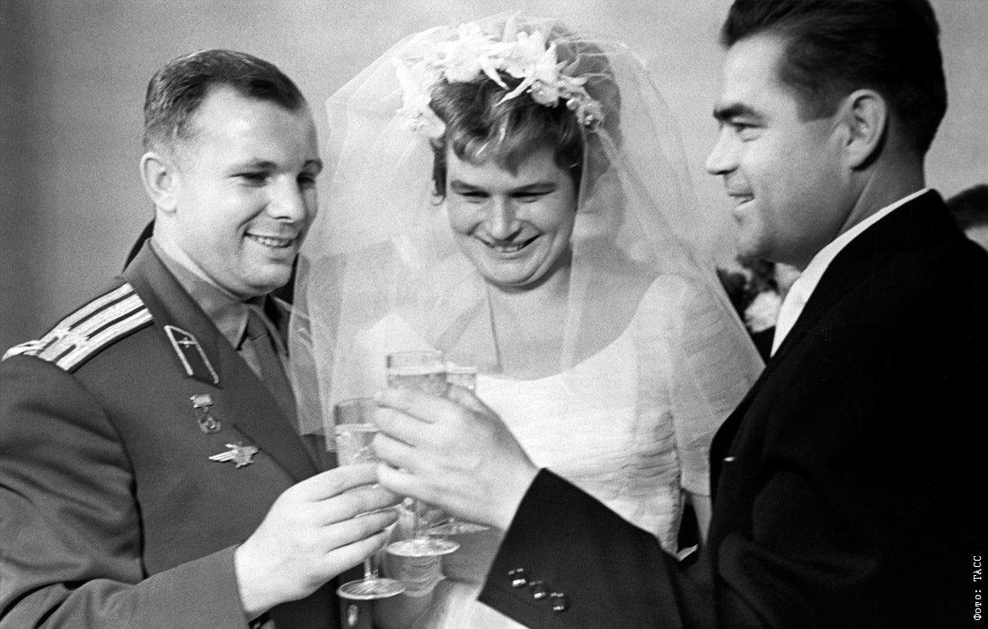 Первый космонавт Юрий Гагарин поздравляет космонавтов Валентину Терешкову и Андрияна Николаева с бракосочетанием. Ноябрь 1963 года.