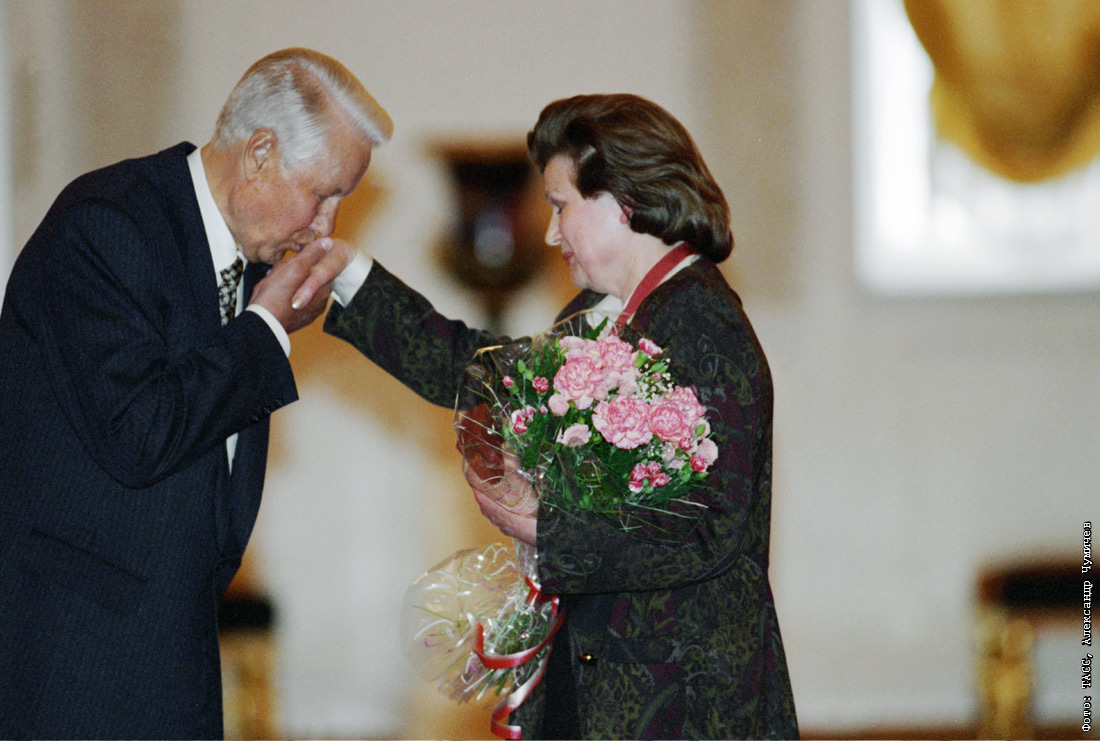 Валентина Терешкова во время получения ордена "За заслуги перед Отечеством" от Президента России Бориса Ельцина в Георгиевском зале Большого Кремлевского дворца. Май 1997 года.