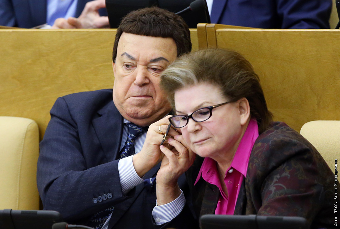 Первый заместитель председателя комитета Госдумы РФ по культуре Иосиф Кобзон и заместитель председателя комитета Госдумы РФ по международным делам Валентина Терешкова. Март 2015 года.