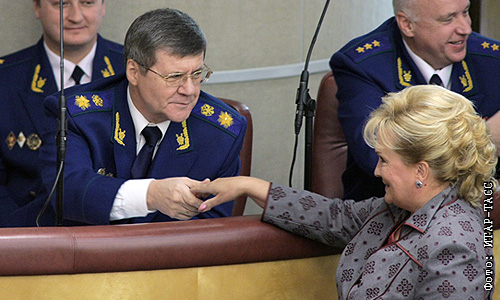 7 октября 2009г. Генеральный прокурор РФ Юрий Чайка (слева на первом плане), вице-спикер Госдумы РФ Любовь Слиска и глава Следственного комитета при прокуратуре РФ Александр Бастрыкин (справа) на пленарном заседании Государственной думы РФ.