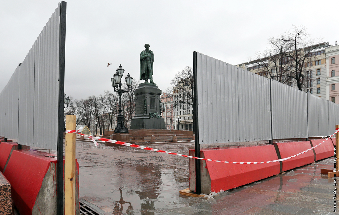 Московский памятник Пушкину на Тверской улице закрыли на реставрацию до сентября 2017 года. Бронзовый монумент покрывает плотный слой дикой патины, из-за которой скульптура имеет неоднородный зелено-голубой цвет. В ходе реставрационных работ будет выполнена расчистка бронзовой поверхности памятника.
