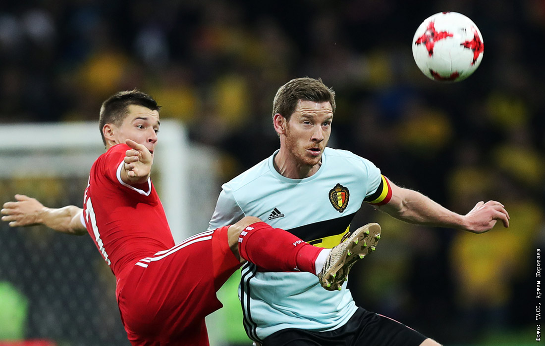 Игроки сборной России Дмитрий Полоз и сборной Бельгии Ян Вертонген