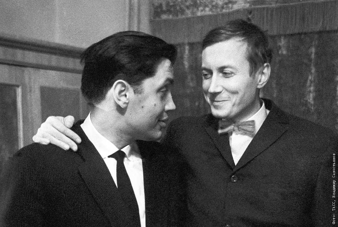 Авторский вечер Роберта Рождественского в Концертном зале имени П.И.Чайковского. Евтушенко (справа) поздравляет поэта. 1962 год, Москва.