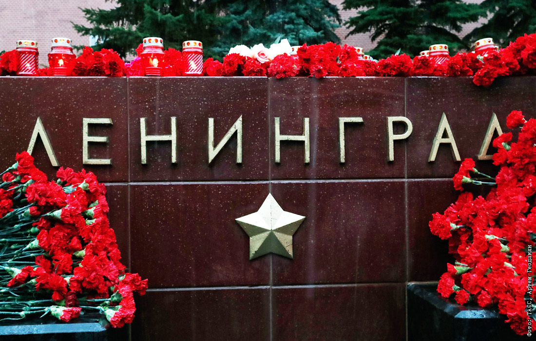 Цветы и свечи у мемориала города-героя Ленинграда в Александровском саду в Москве