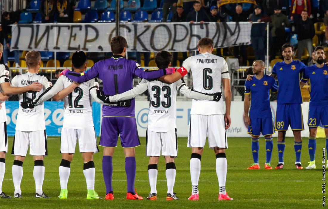 Игроки "Ростова" и "Краснодара" во время минуты молчания в память о погибших в Санкт-Петербурге перед началом матча чемпионата России по футболу