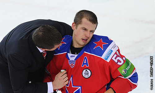 Игрок ЦСКА Сергей Широков (справа), получивший травму в матче чемпионата КХЛ: ЦСКА (Москва) - "Динамо" (Москва) - 2:0.