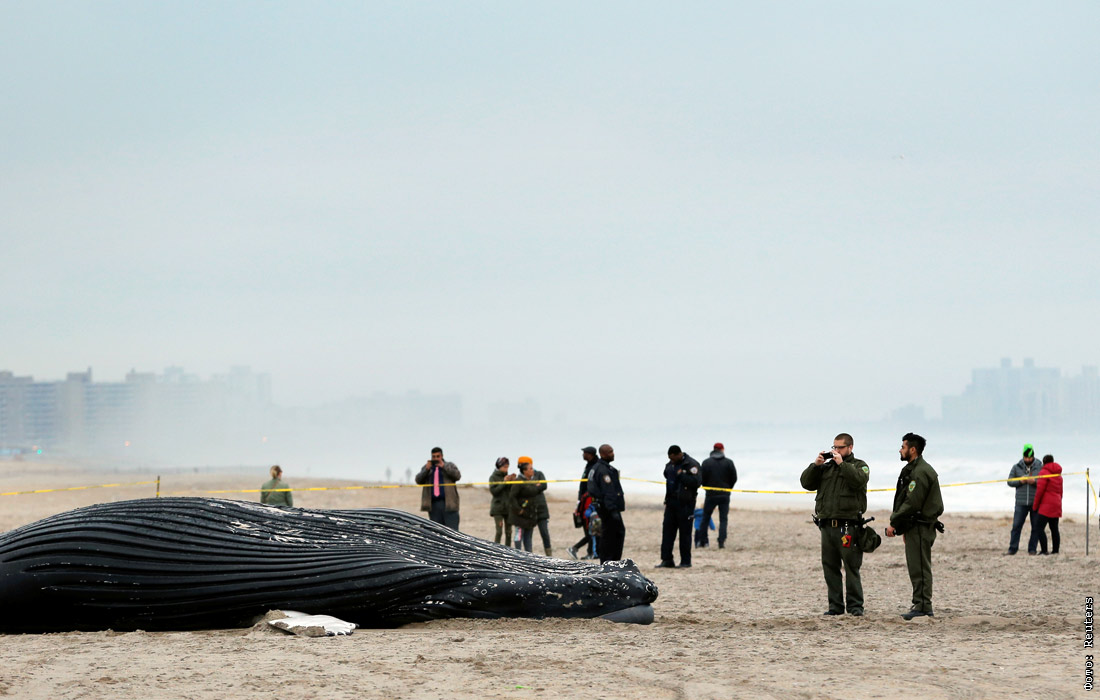 Жители Нью-Йорка обнаружили на пляже района Куинс тушу мертвого горбатого кита. Сотрудники полиции, прибывшие на место происшествия, поставили ограждение от людей, желающих сделать фото и видео. Специалисты выясняют точную причину смерти млекопитающего.