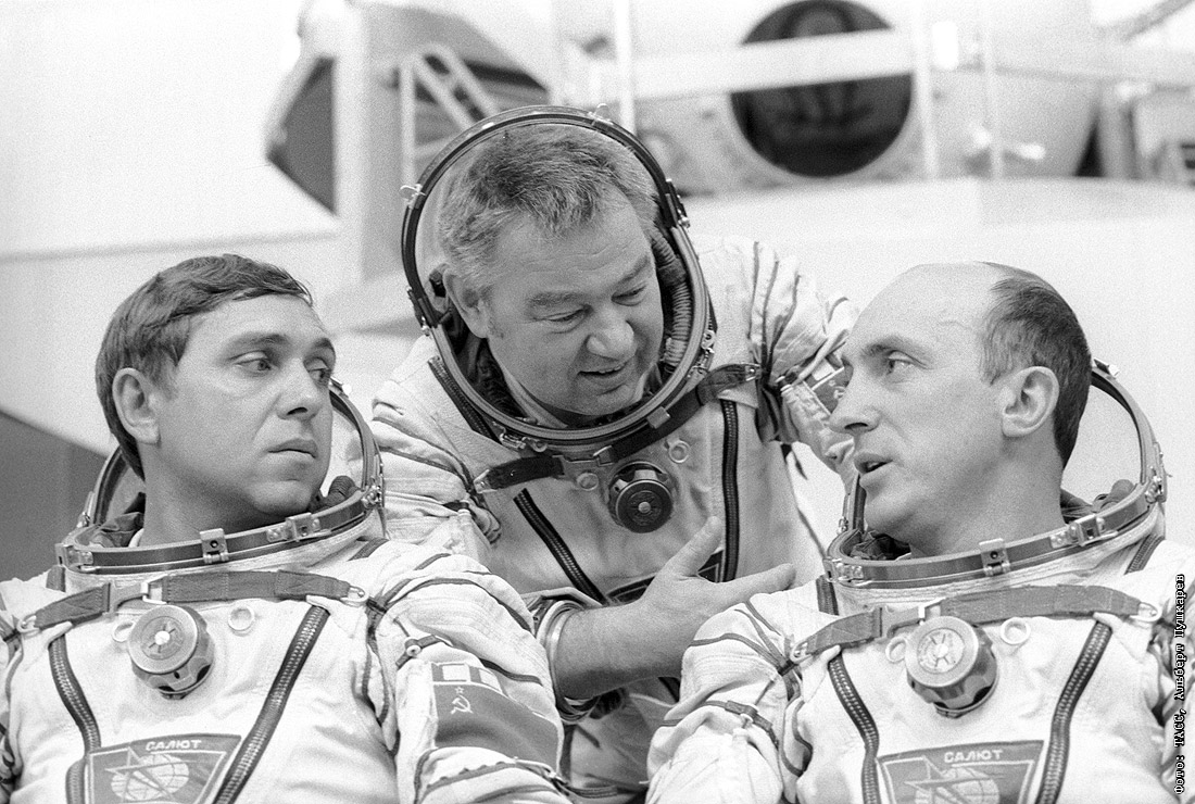 1985 год. Члены экипажа космического корабля "Союз ТМ-14" Александр Волков, Гречко и Владимир Васютин в Центре подготовки космонавтов имени Ю.А.Гагарина. Полет с 17 по 26 сентября 1985 года стал третьим для Гречко. В нем он участвовал в качестве бортинженера "Союза-Т-14" (старт) и "Союза-Т-13" (посадка)
