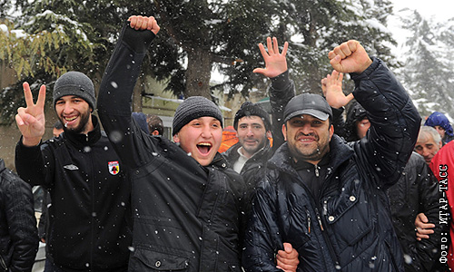 Цхинвал. 29 ноября. Сторонники кандидата в президенты Южной Осетии Аллы Джиоевой во время "марша мира" на Театральной площади.