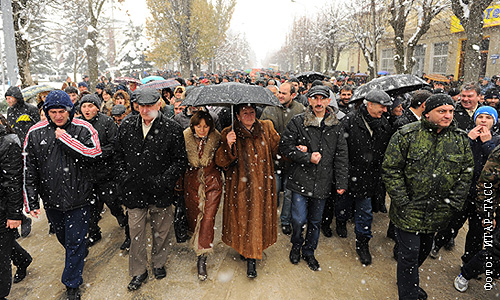 Цхинвал. 29 ноября. Кандидат в президенты Южной Осетии Алла Джиоева (в центре справа) со своими сторонниками во время "марша мира".