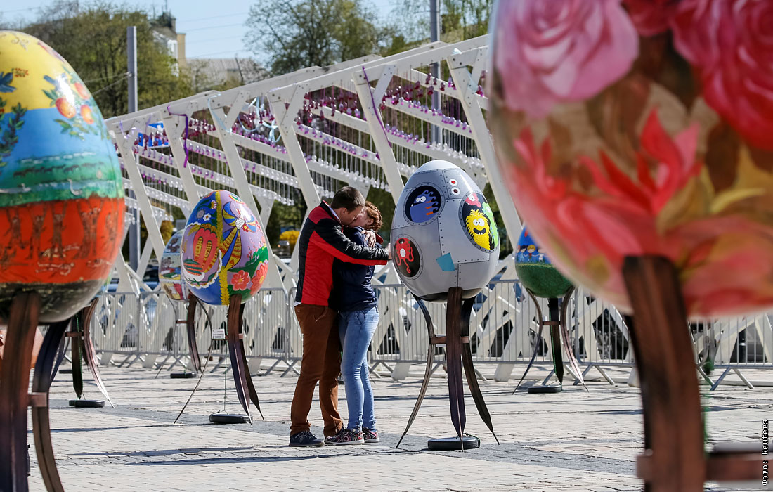 Фестиваль писанок (расписанные яйца) проходит на Софийской площади в Киеве в преддверии Пасхи