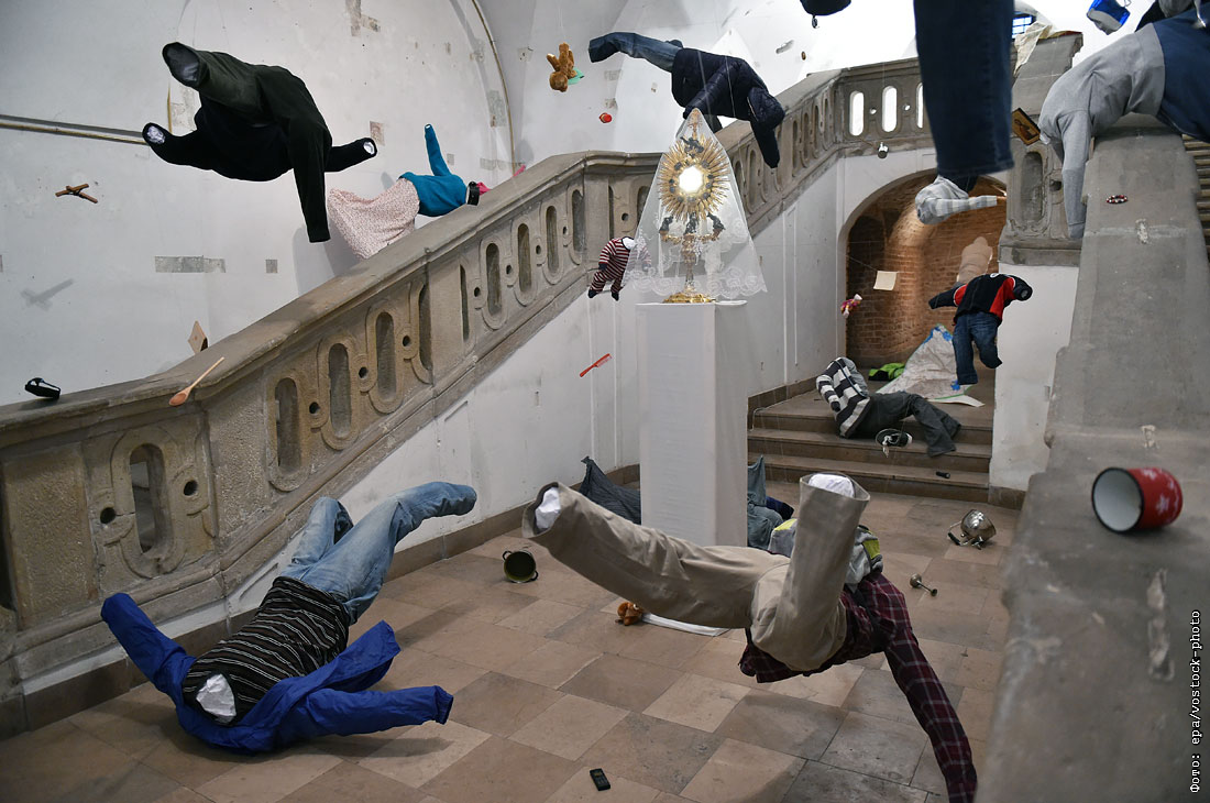 Инсталляция польского художника Якуба Завадзински, посвященная проблемам беженцев на Ближнем Востоке в одной из церквей Кракова
