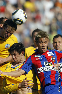 Игроки "Ростова" Станислав Иванов, Иван Живанович и армеец Кейсуке Хонда (слева направо) в матче чемпионата России по футболу: "Ростов" (Ростов-на-Дону) – ЦСКА (Москва) – 1:0