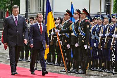 Президент Украины Виктор Янукович и президент России Дмитрий Медведев (слева направо) на церемонии официальной встречи