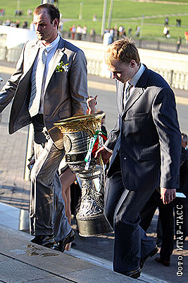 Игроки "Ак Барса" Степан Захарчук и Василий Токранов (слева направо) во время чествования команды, ставшей победителем чемпионата России по хоккею – обладателем Кубка Гагарина