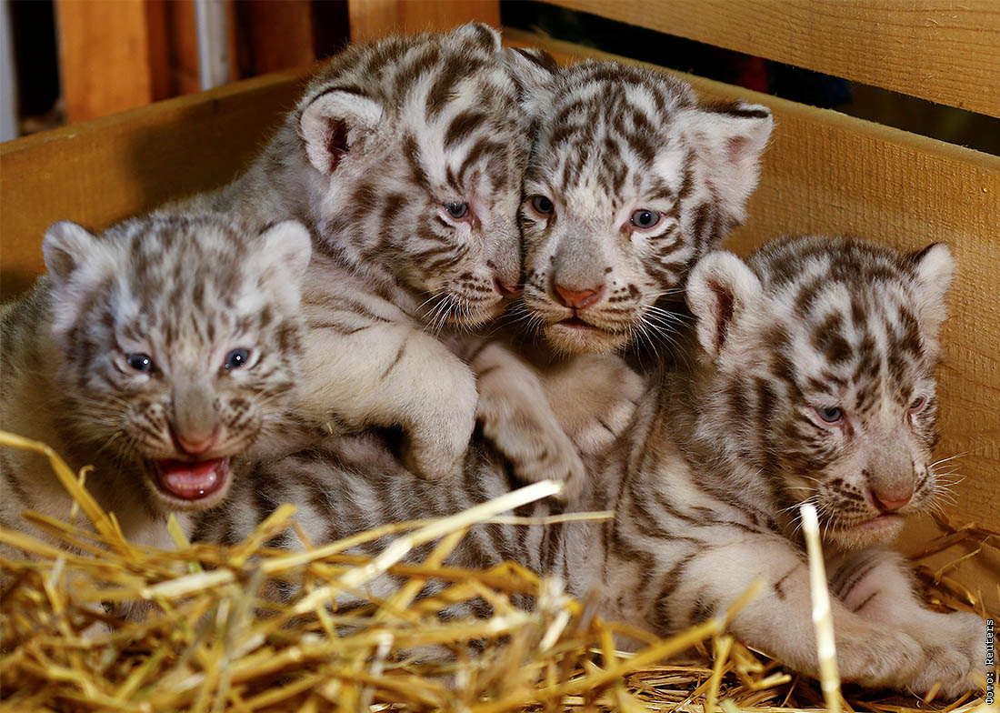Пополнение в Белом Зоопарке Кернхоф, Австрия. Четыре белых бенгальских тигренка родились недавно, а сегодня впервые сфотографировались.