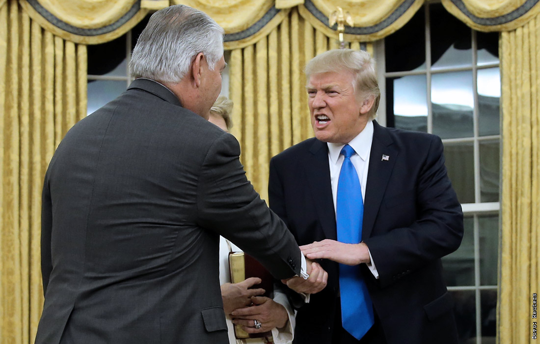 Дональд Трамп хорошо известен своими долгими и весьма крепкими рукопожатиями. Глава Белого дома США хватает за руку своих собеседников и несколько раз резко дергает к себе. На фото: президент США жмет руку новому госсекретарю США Рексу Тиллерсону.
