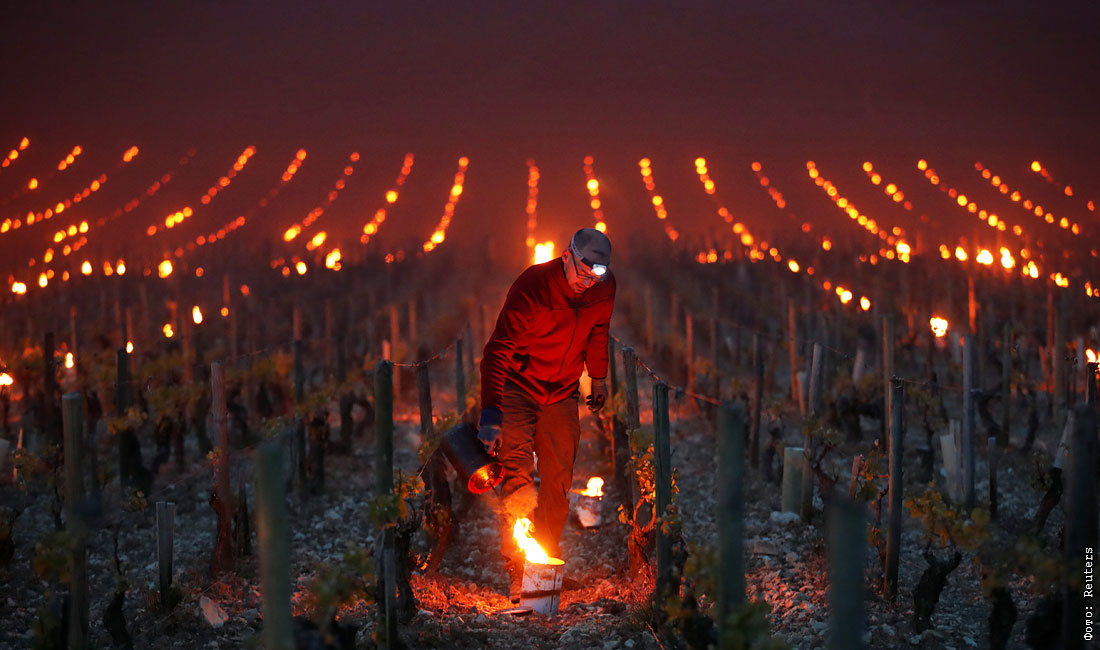 Защита виноградников от аномальных весенних заморозков в Шабли. Франция.