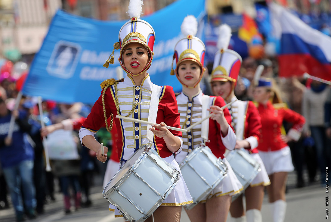 По российским городам прошли массовые акции в честь Дня весны и труда. Самым многолюдным стало праздничное шествие на Красной площади в Москве, организованное профсоюзами, - свыше 100 тысяч участников.