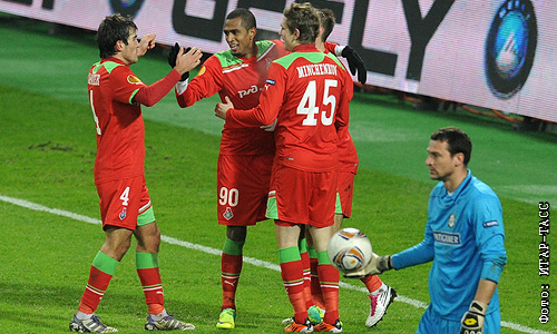 Игроки "Локомотива" Альберто Сапатер, Майкон, забивший гол, Александр Минченков (слева направо на втором плане) и вратарь "Штурма" Сильвие Чавлина (на первом плане) в матче Лиги Европы по футболу: "Локомотив" (Москва, Россия) - "Штурм" (Грац, Австрия) - 3:1.