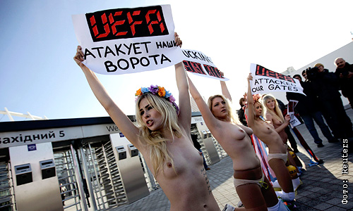 Активистки женского движения "FEMEN" провели в Киеве топлесс-акцию протеста против проведения на Украине Евро-2012.