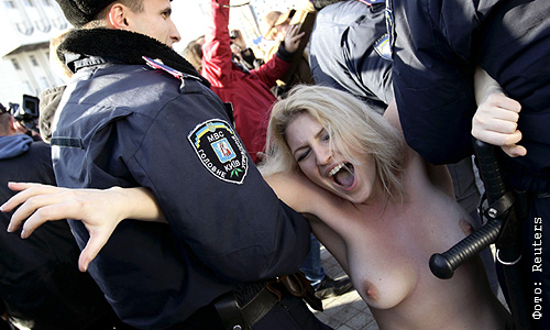 Активистки женского движения "FEMEN" провели в Киеве топлесс-акцию протеста против проведения на Украине Евро-2012.