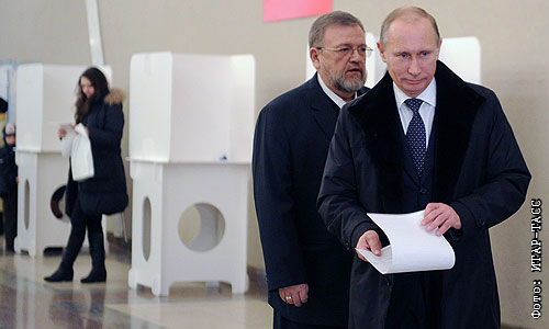 Премьер-министр РФ Владимир Путин во время голосования на выборах в Государственную думу РФ на избирательном участке №2079 в Российской академии наук.