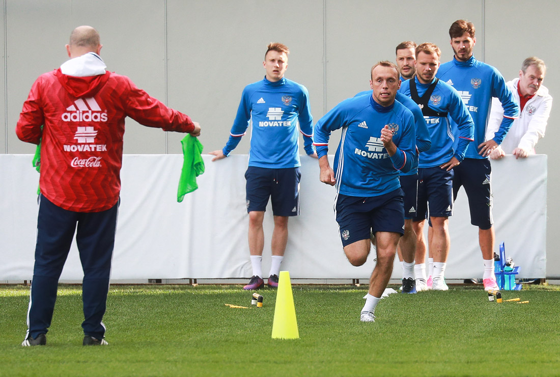 Футболисты сборной России под руководством Станислава Черчесова начали подготовку к Кубку конфедераций тренировкой на подмосковном стадионе "Арена Химки"