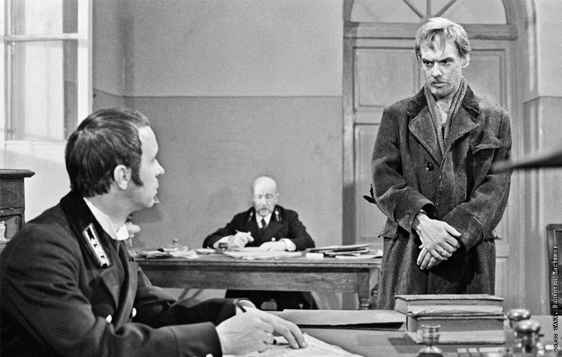 Артист Олег Борисов в роли следователя и артист Алексей Баталов в роли Федора Протасова (на первом плане слева направо) во время съемок художественного фильма по пьесе Льва Толстого "Живой труп". 1968 год.