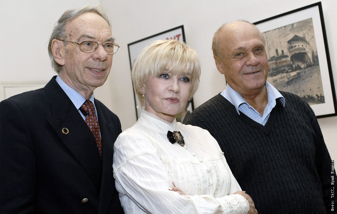 Актер Алексей Баталов, актриса Вера Алентова и актер Владимир Меньшов на праздновании 80-летнего юбилея Баталова в Москве. 2008 год.