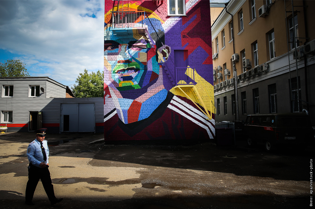 Граффити с изображением игрока сборной Португалии Криштиану Роналду на стене дома в одном из дворов Казани