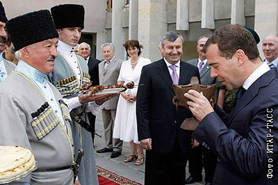 Президент России Дмитрий Медведев во время торжественной церемонии встречи у здания администрации президента республики. На втором плане в центре - президент Южной Осетии Эдуард Кокойты