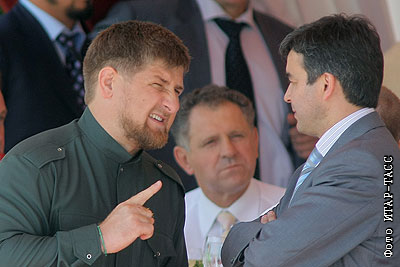 Президент Чечни Рамзан Кадыров и исполняющий обязанности президента Ингушетии Рашид Гайсанов (слева направо на первом плане) перед началом скачек на приз президента РФ на Центральном Московском ипподроме