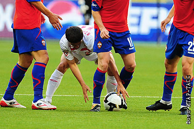 Игрок "Спартака" Марат Дзахмишев (в белой форме) в матче чемпионата России по футболу: ЦСКА (Москва) – "Спартак" (Нальчик) – 0:0