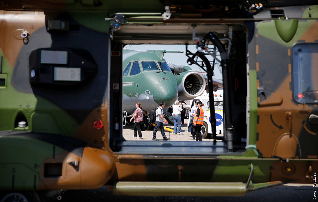 Вид на двухмоторный военно-транспортный самолет Embraer KC-390