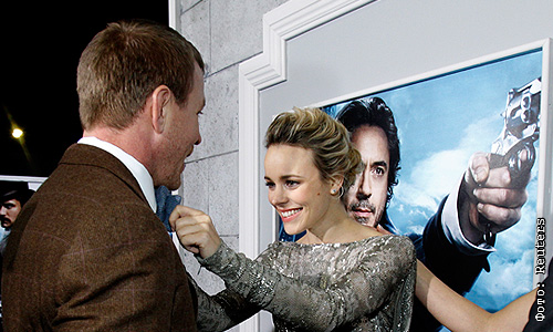 Рэйчел МакАдамс поправляет бабочку режиссеру Гаю Ричи на премьере фильма "Шерлок Холмс: Игра теней" в Лос-Анджелесе.