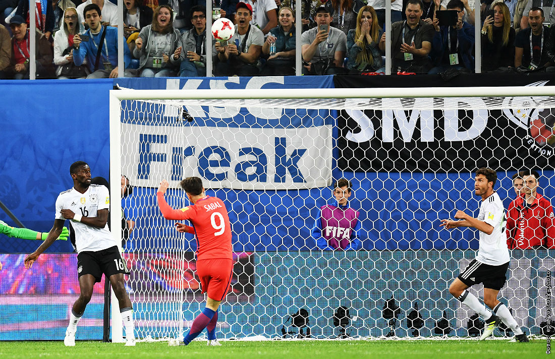 Нападающий сборной Чили Анхело Сагаль (№9) наносит удар по воротам немецкой сборной