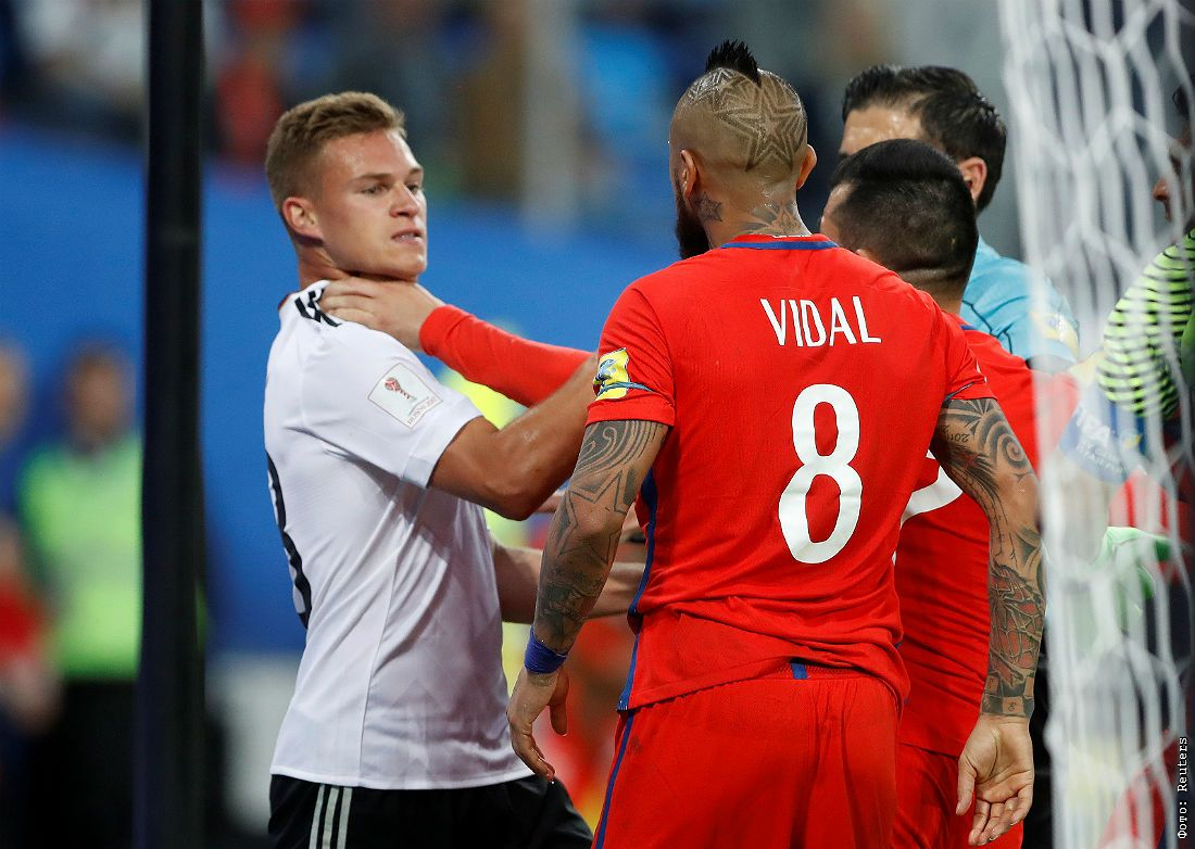 Стычка на поле с участием игрока сборной Германии Джошуа Киммиха, футболистов команды Чили Артуро Видаля и Гари Меделя (слева направо)