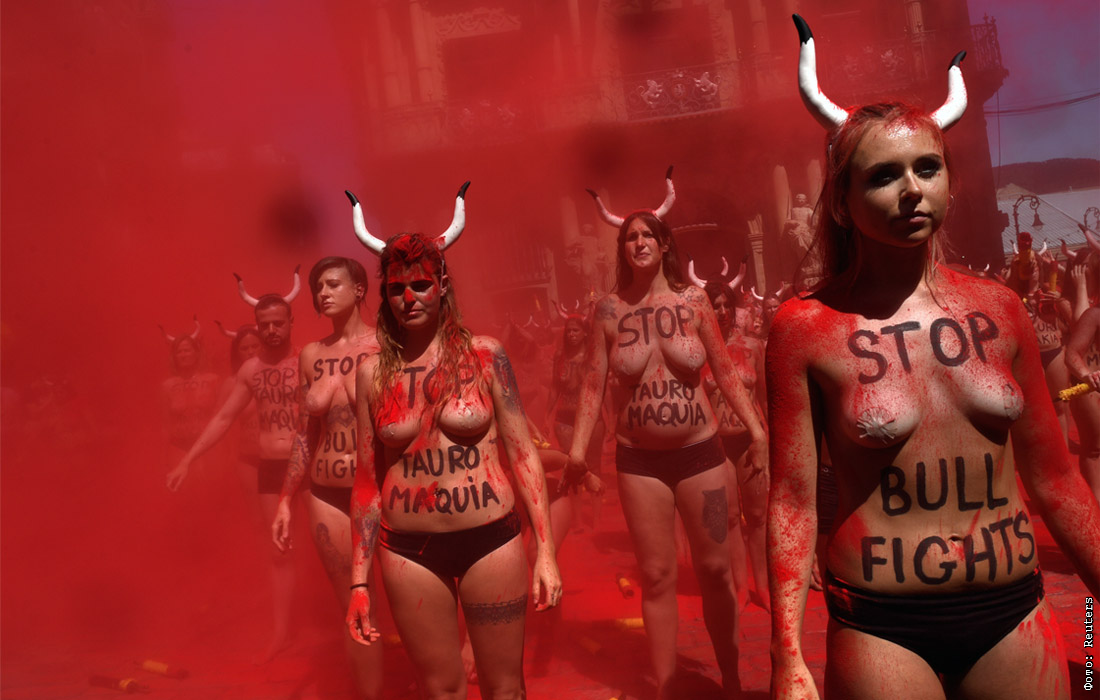 Акция против проведения корриды состоялась в испанской Памплоне. Полуобнаженные активисты выступили против издевательства над быками и убийства животных во время боев.