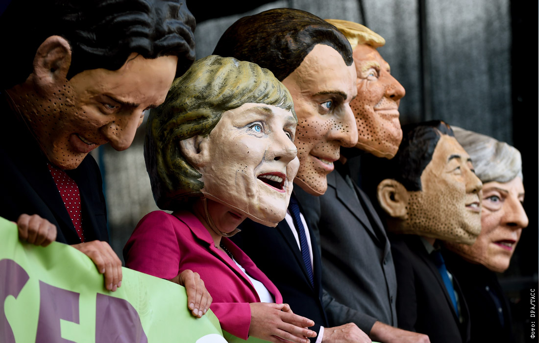 Участники акций протеста против саммита G20 в масках с изображением лидеров стран "двадцатки"