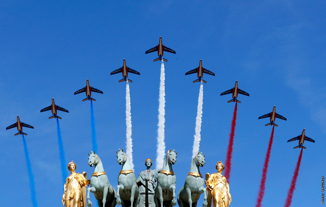 Самолеты "Альфа Джет" пилотажной группы "Патруль де Франс" выпускают дым с цветами национального флага над Триумфальной аркой