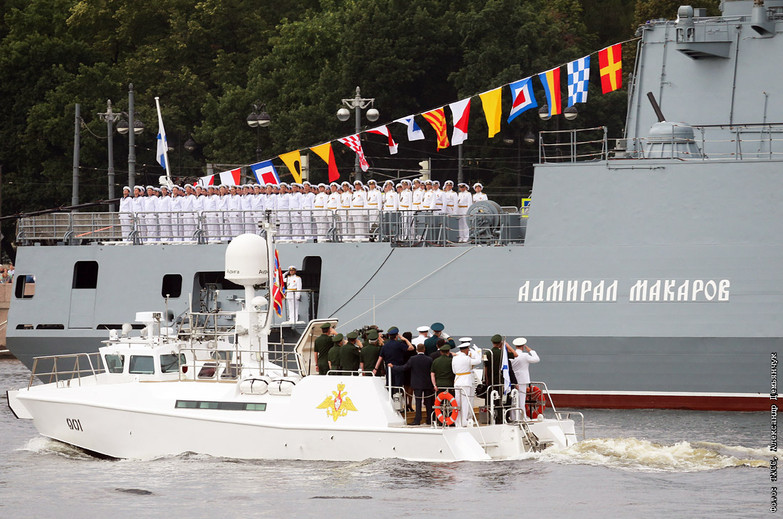 В парадной линии на рейде Невы в репетиции принимают участие установленные на швартовых бочках фрегат "Адмирал Макаров", корвет "Стойкий", подводная лодка "Дмитров"