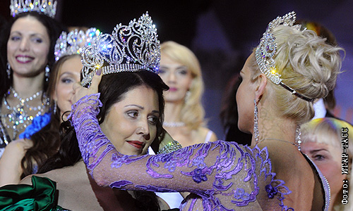 Победительница конкурса красоты "Миссис Россия-2011" Юлия Заважанская и победительница конкурса красоты "Миссис Земной шар" Алиса Крылова (слева направо на первом плане) на церемонии награждения.