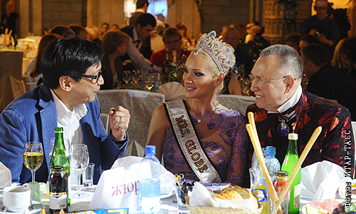 Режиссер Егор Кончаловский (слева), победительница конкурса красоты "Миссис Земной шар" Алиса Крылова и модельер Слава Зайцев на финале конкурса красоты "Миссис Россия-2011".