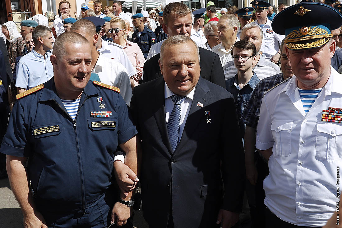 Руководитель управления учебной и воспитательной работы Следственного комитета Российской Федерации полковник юстиции Сергей Петров, председатель комитета Госдумы РФ по обороне Владимир Шаманов и командующий Воздушно-десантными войсками (ВДВ) России Андрей Сердюков (слева направо) во время крестного хода от храма Пророка Божия Илии до Красной площади в рамках празднования Дня Воздушно-десантных войск РФ